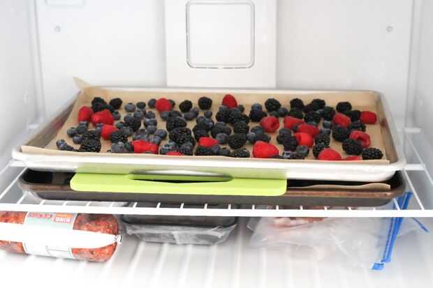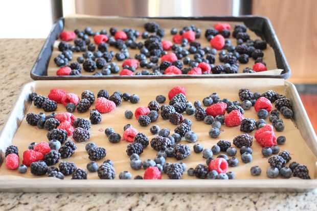Pop las bayas en el congelador para un par de horas, o hasta que estén sólida y agradable. Colocar una charola en el congelador y luego poner una tabla de cortar a través de él, así puedo coloco la charola en la parte superior sin exprimir las bayas.