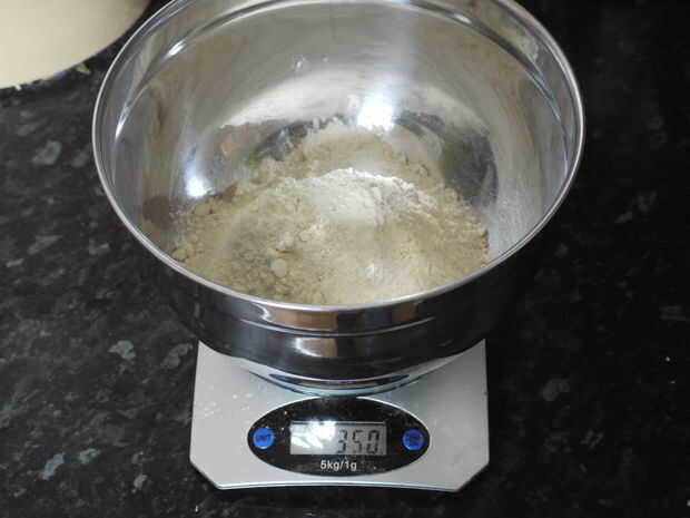 Desmenuzar la levadura en un bol y añadir sobre dos veces tanta harina. No es crítica como mucha harina, pero ayuda a hacer hasta un múltiplo conveniente de panes. En este caso he hecho lo hasta 350g, por lo que cada uno será aproximadamente de 35g.