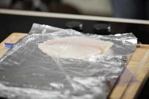 Coloque el pescado fresco (o cualquier carne pasan frío) sobre la envoltura de plástico hacia arriba en el centro.