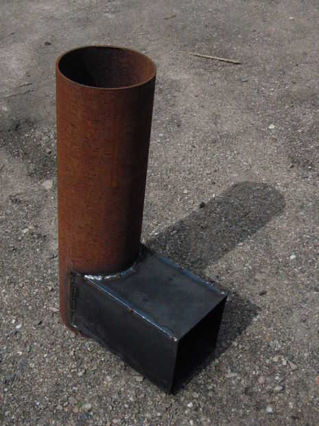 Cortar la longitud del tubo de modo que es 60-70cm largo a 90 grados. Cortar un cuadrado de la tubería de alimentación de madera en él. Hacer una caja de chapa de acero que encaja limpiamente en el tubo y .weld todos juntos.