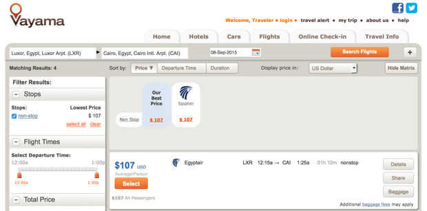 Utilice su sitio favorito de reserva como Expedia, Skyscanner, Vayama o Flighthub para comprobar el precio publicado y la lista de la compañía para la ruta deseada. Por ejemplo: queríamos volar de Luxor (LUX) a el Cairo (CAI) para el 8 de septiembre y descubre Egyptair ofrece esta ruta.