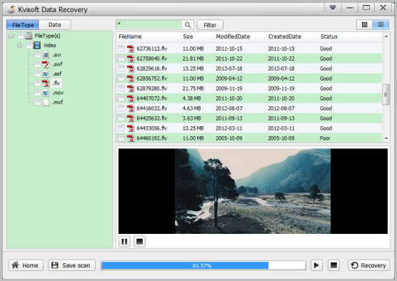 Ir a tipos de archivos para navegar los vídeos flash escaneados u otros archivos. Seleccione un vídeo flash para escuchar en la interfaz de Kvisoft Windows Data Recovery Software. Si usted ha encontrado los archivos videos o flashes flashes intactos que necesita, por favor, resáltelo y haga clic en el botón Recovery para recuperarlo.