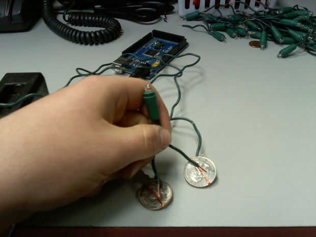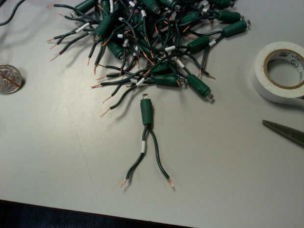 Para hacer que los LEDs de prueba más fácil y rápido, he envuelto y con cinta los cables alrededor de dos cuartos de los Estados Unidos (cualquier moneda grande hará) para darme un punto de contacto más grande. Uno de los cables ha sido etiquetado con un poco de blanco de cinta aislante para significar es el VCC y el otro es la tierra.