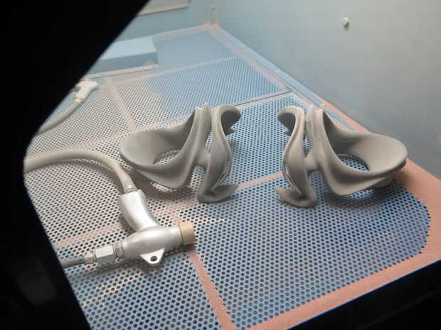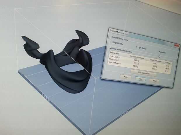 Una vez listo - me he cargado el archivo en la computadora y con la especial software de la impresora OBJET que comprobé si todo estaba correcto antes de 'imprimir' para que la pieza puede ser impreso. 3D imprimir el diseño en uno de los 7 OBJET500 Connex de impresoras en el muelle 9 durante mi residencia de AutoDesk/Instructables - uno shoulderpiece tomó más de 33 horas para imprimir - por Gabe (responsable de las instalaciones de impresión 3D) y yo elijo cargar la máquina con material doble así que sólo tomó la mitad del tiempo. Cada pieza acabó llevándose 19,20 horas (20 horas) para imprimir en alta velocidad. Elijo hacerlo en alta velocidad ya que el diseño no tenía mucho detalle, básicamente no importa mucho.