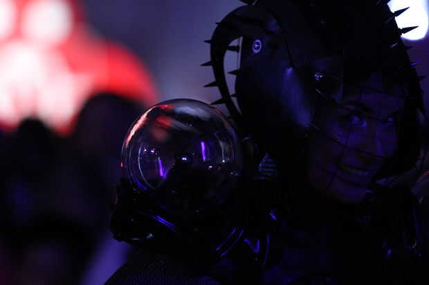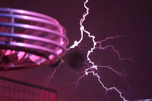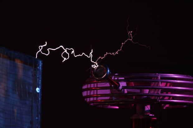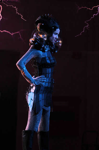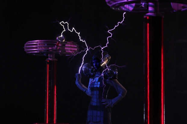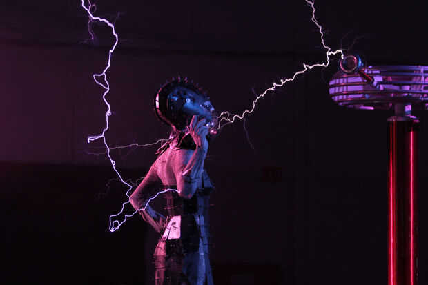 AJUSTE: Dos mano ingeniería personalizado había construido bobinas de Tesla por ArcAttack tiro a arcos eléctricos hasta doce pies de largo, cada uno actuando como un instrumento con un sonido que recuerda a los primeros días del sintetizador.