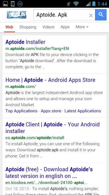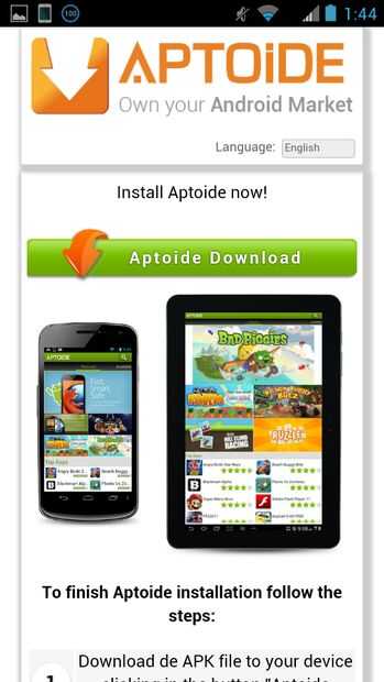 Primero tiene que aptoide. Aptoide es una tienda de aplicaciones que permite añadir otros tiendas de aplicaciones a sí mismo. En estas tiendas de aplicaciones, hay un montón de diferentes aplicaciones que Google play no tiene, incluyendo pájaros flappy. Así que ir al navegador y buscar: aptoide.apk. Debe ser el primero de ellos en la búsqueda. Abrir el sitio y haga clic en descargar. Ir a tus descargas y abrirlo e instalar en su dispositivo.