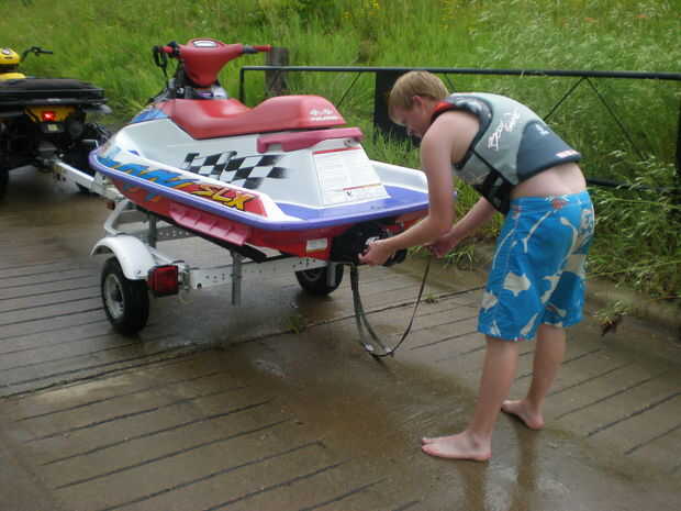 Tome este momento fuera del agua para descolgar cualquier correas extras que tenga en el remolque en este momento (que significa las cintas de conexión del remolque a la moto y no el remolque al vehículo).