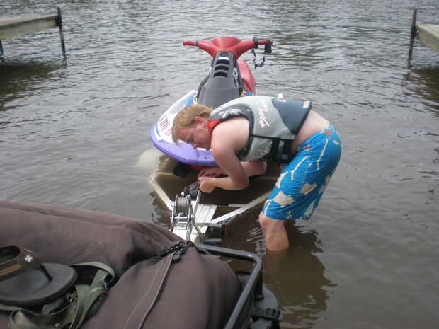 Antes de que copia la moto completamente en el agua, desenganche la correa delantera. Asegúrese de hacerlo antes de respaldo completamente en; flotante Jet Ski se lío si tratas de desenganche en el agua. Puede tirar un cuchillo. No estoy diciendo que, pero es algo inestable.