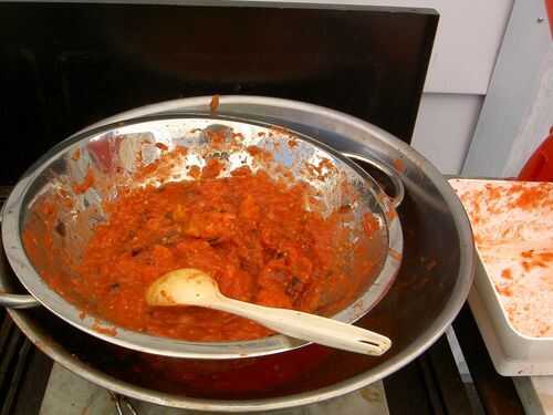 4. cuando el nivel de stock llega al fondo del colador, vierta el contenido del bol en una olla (si está procesando ese día) o en grandes contenedores para almacenar en el refrigerador o el congelador para más adelante procesar. He elegido para procesar ese día ya que planeaba congelar la pulpa para algunas salsas de carne más tarde en septiembre.