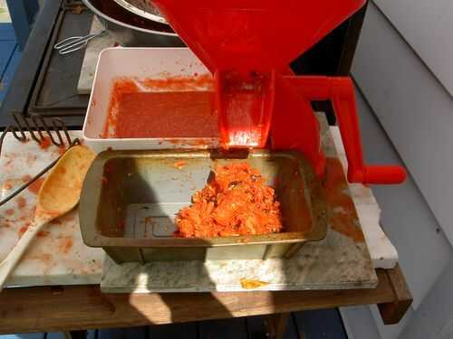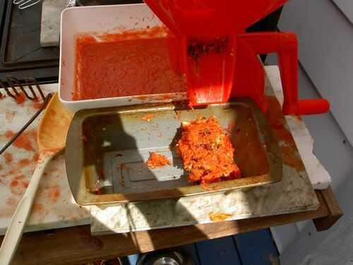 Colocar los tomates cocidos en la tolva del molino. Con el tazón de fuente en el lugar para recoger la pulpa y algo en su lugar para recoger los escombros. Encontré que una bandeja de pan de silicio funciona muy bien para esto: encaja perfectamente debajo del pico de escombros, tiene una buena capacidad y es bin fácil vacía en la tolva para una segunda carrera y en el compost cuando esté listo. Con mi molino, todavía hay poco de pulpa en los escombros después de la primera carrera. Me lo pones de nuevo en la tolva y generalmente obtener otra media taza de pulpa de la carga de la tolva completa.