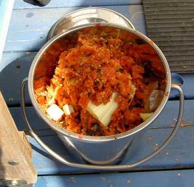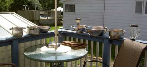 Una vez que los frascos de stock en la olla para hacer conservas, comencé limpieza grave: cuatro macetas, un colador grande, un recipiente grande, una licuadora, cucharas, un cucharón, un machacador, cuchillos y el molino de tomate. El contador al lado del fregadero doble celebraba los resultados de la jornada, una mitad del fregadero doble celebró un palero cargado, y salió el desbordamiento en el riel de la cubierta bajo el sol.