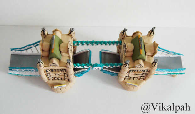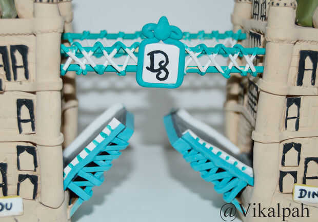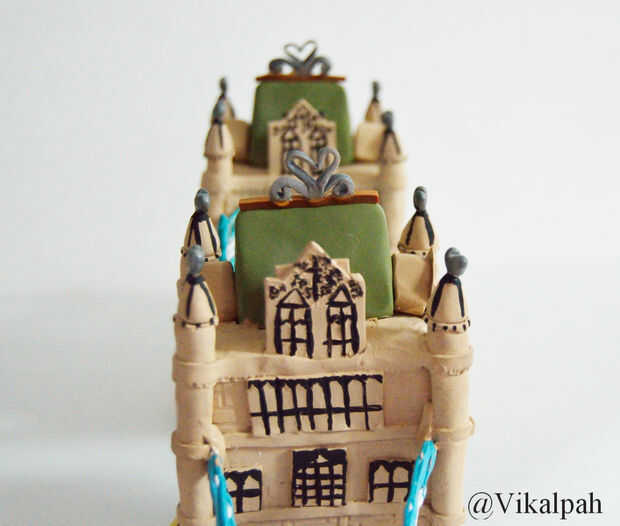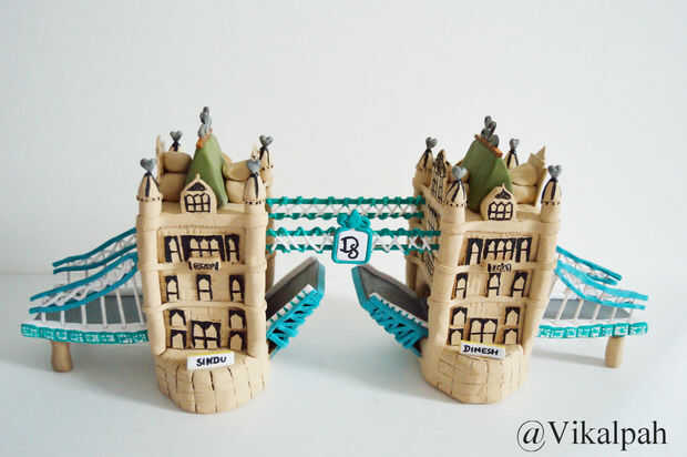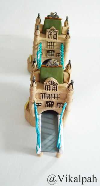 Utilizando arcilla líquida, une los caminos de arcilla a los bloques de arcilla cubierta de cartón y al horno les. También he añadido un pedazo pequeño de arcilla a las esquinas inferiores de los caminos a los lados de apoyo. Luego agregar vigas adicionales en las esquinas de los bloques de dos edificios y añadieron ventanas, pequeños corazones en el marco superior y centro en la viga de centro también conocido como bambú pincho. Después de la cocción todo, utilicé pintura acrílica para agregar sus iniciales en el marco del centro, los nombres en el pedazo delantero blanco de los dos bloques y los detalles de ventana. Permite que se sequen. Ahora el bello puente de Londres está listo. :)