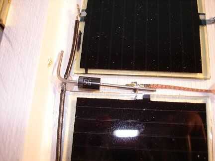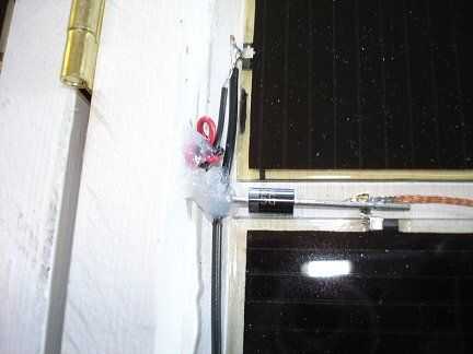 A continuación instalé los cables que salen del panel. Yo les funcionó hacia fuera a través de un agujero perforado en el lado de la bisagra del panel. Había soldado el cable rojo en el cátodo del diodo y el cable negro con el riel negativo. Ató un nudo en los cables para el alivio de tensión y usa gotas de masilla de silicona para fijar todo en su lugar.