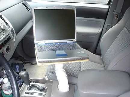 La última foto muestra la bandeja poniendo a prueba en el carro. Funciona bien y se ve muy bien. Las piezas de PVC no pegan pero en este momento. Quería asegurarse de que el brazo era justo con una prueba de la escala primera. Simplemente ajuste seco junto, la fricción de las piezas de PVC sostuvo el peso de la laptop bien. Estaba muy contento con la posición de la computadora portátil. Así que pegan las piezas de PVC. Me gusta la forma de que la bandeja será solo saque derecho cuando no sea necesario o si tengo un pasajero. No se necesitan herramientas. Debido al ajuste exacto del acoplador en el sostenedor de taza, el peso de la laptop traba la bandeja en su lugar. Pero si Levante en la bandeja un poco, puedo girar alrededor en posiciones diferentes. Se traba otra vez cuando suelto de la misma. Un bono inesperado!