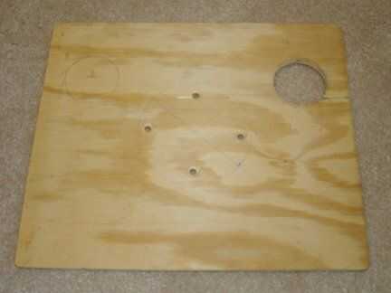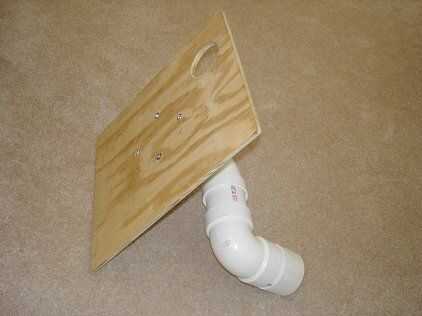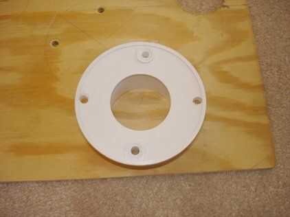 Perforar cuatro agujeros en el PVC de drenaje apropiado. luego lo colocó en el centro de la madera contrachapada y transferir la ubicación de los orificios y perforados hacia fuera para que coincida con el los agujeros de la conexión.