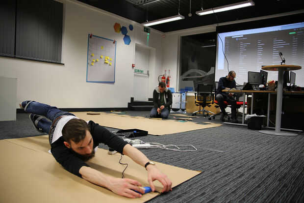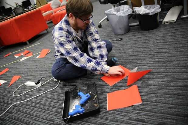 Cuando empezamos a elaborar los ladrillos, nos dimos cuenta que necesitábamos una línea de producción, de lo contrario no vamos a terminar a tiempo para sorprender a todos a la mañana siguiente. Dos del equipo de cortan y prepararon los paneles de ladrillo mientras que los otros dos les pegan en las paredes. Al final, hicimos más de 480 ladrillos.