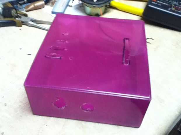Encontrar un caso y taladre los orificios necesarios para el conmutador, potenciómetro y jack de audio. (He añadido interruptores adicionales para posibles adiciones que planeo hacerlo)