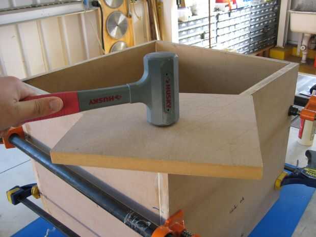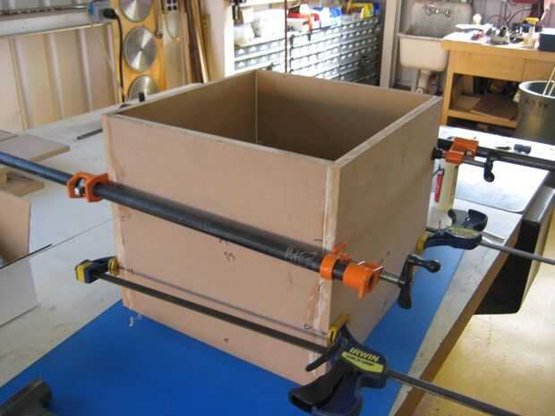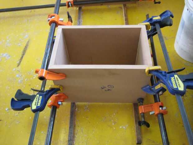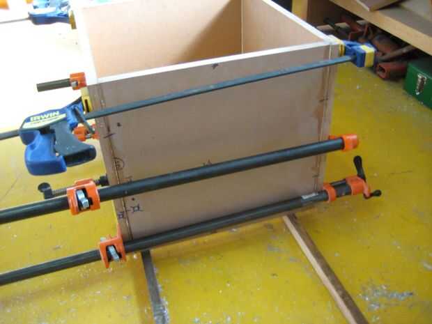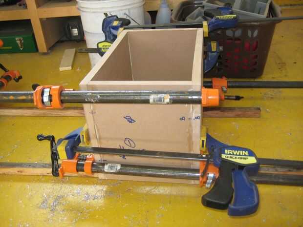 Aplique una cantidad suficiente de pinzas y esperar a que las paredes exteriores del gabinete para secar. Como se puede ver en las imágenes de abajo, abrazaderas son ideales para este propósito, y si usted está necesitando una excusa (o dos) para comprar algunos, 42" altura torre de altavoces son buenos.