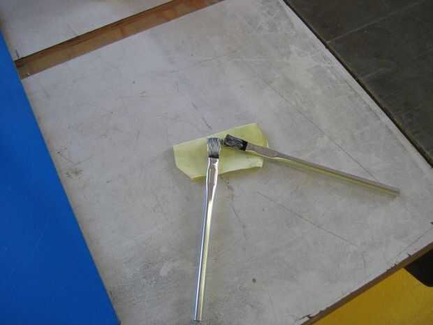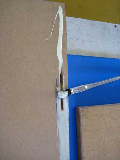 Aplique una gota fina de pegamento madera de alta calidad (me gusta Titebond yo mismo) a lo largo de los bordes de los lados adyacentes. Asegúrese de extender pegamento extra dentro de los agujeros para las galletas. Usar un cepillo de chip para pintar la cola en posición y separó el grano uniformemente en una franja de 3/4".