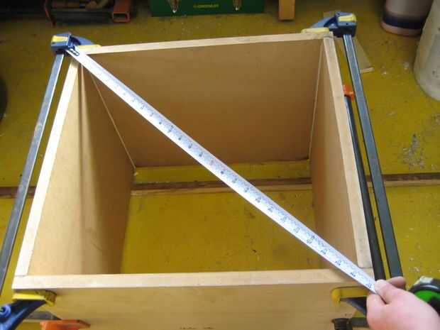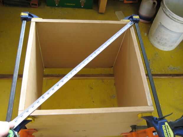 Con los bordes pegados y las abrazaderas holgadamente en su lugar, ahora es el momento de cuadrado todo para arriba. Usando una cinta métrica y las abrazaderas, medir la diagonal de esquina a esquina de la plaza que acaba de crear y ajustar las pinzas hasta que ellos sean iguales. Esto significa que la caja es perfectamente cuadrada. Ver las fotos de abajo.