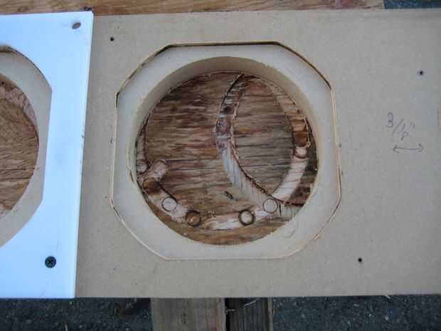 Si está utilizando un enrutador, use una broca recta de 1/8" o 1/4" para recortar el círculo para eliminación de poco material como sea posible. El mayor se va la broca más material tienes que comer a través de, el polvo más que crea y más lento el proceso. Hacer varias pasadas, incremental hundiendo más y más profundamente a través de la cara frontal.