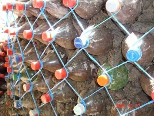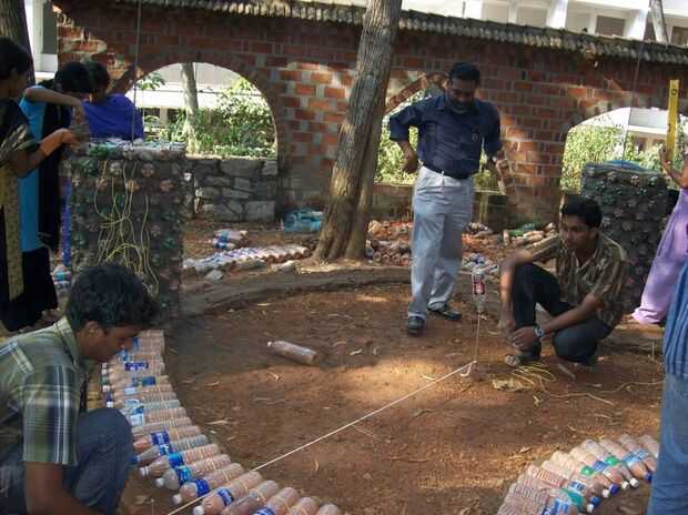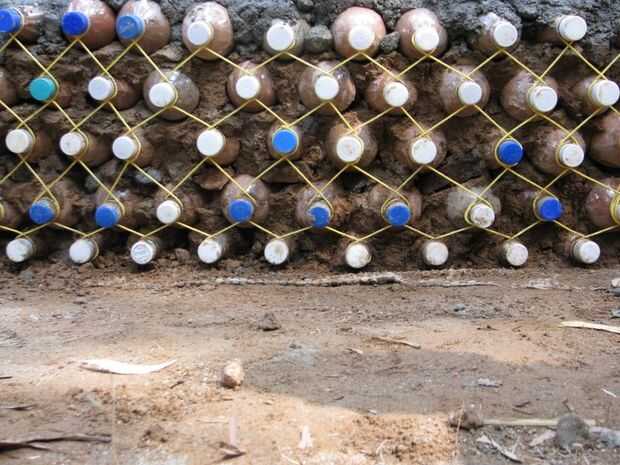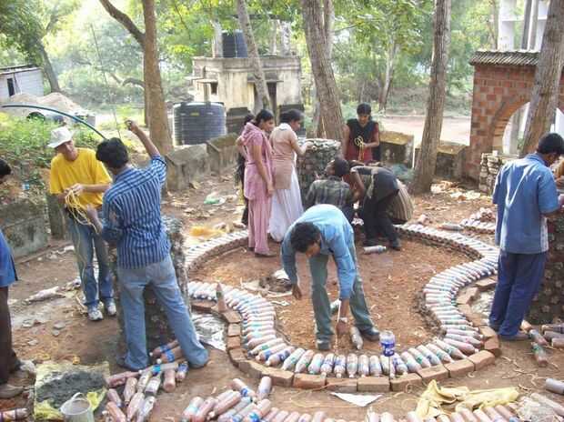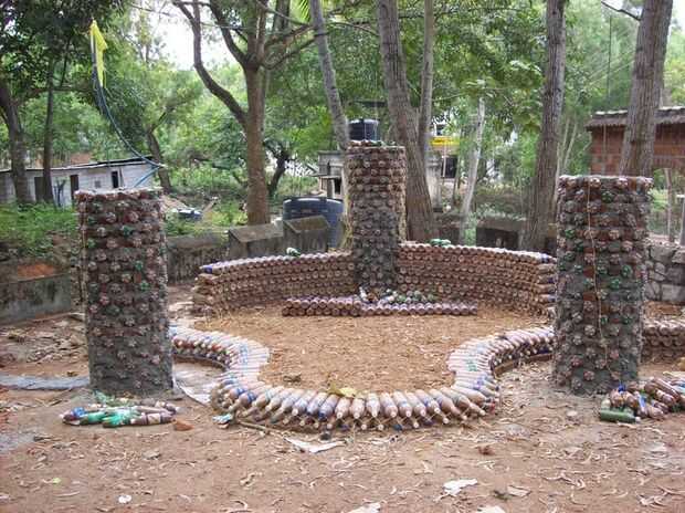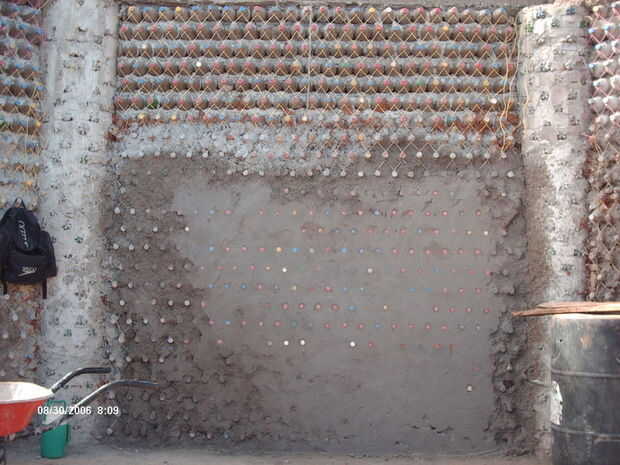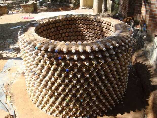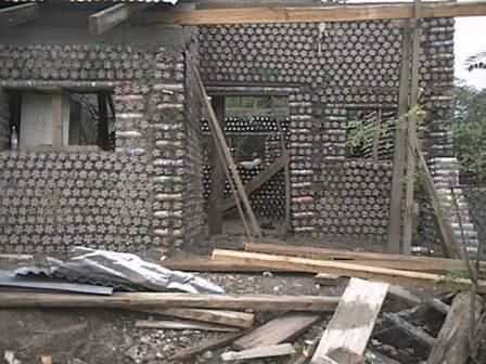 Algunas estructuras (incluyendo residencias, tinacos, asientos etc) construido con pet botellas se muestran aquí