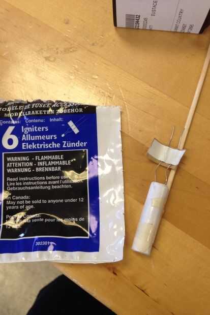 Una vez que el conjunto es perforado, coloque el encendedor en el orificio y para mantenerla en su lugar, coloque un tapón en el orificio. Una vez terminado este paso, el cohete está ahora completado.