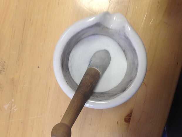 El nitrato de potasio debe ser molido en un polvo muy fino. Ayuda a incrementar la superficie y proporcionar una combustión rápida y limpia cuando se enciende. Vierta poco tipifica para hacerlo más fácil de moler.