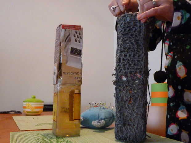Coloque los trozos del prisma rectangular sobre la botella. La base del prisma debe estar en la base de la botella. Los 4 lados hasta la parte superior de la cartulina de estirar y doblar cualquier extra en el interior. Use los pernos para asegurar el hilo a la cartulina. Puse los pasadores en la parte superior de la cartulina.