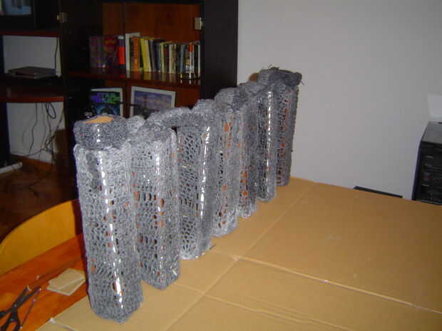 Medir una línea va longitudinalmente hacia abajo su cartón para que todas las piezas de base será una línea recta. Encontrar algo cuadrado que mide 5 cm x 5 cm (Yo utilicé una caja de jugo) para hacer la separación entre las piezas de base uniforme. Utilice una pistola de pegamento caliente para pegar las piezas base en su lugar. Durante este paso, es importante que las piezas base rectas y equidistantes.