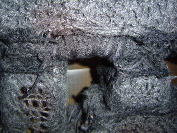 Conectar entre sí las dos piezas largo arcos. Las dos piezas que satisfacen en el centro de la pieza base necesitan estar conectado para unos 2 cm de su altura. Este es un paso fácil, pero también es fácil tirar las piezas demasiado lejos aparte o cambiar la forma del arco que ha creado. Coser sin apretar, pero con firmeza. Usé sólo 5 bucles para conectar cada pieza, asegurándose de que en la esquina y cruzan toda la pieza de arco a la siguiente esquina.