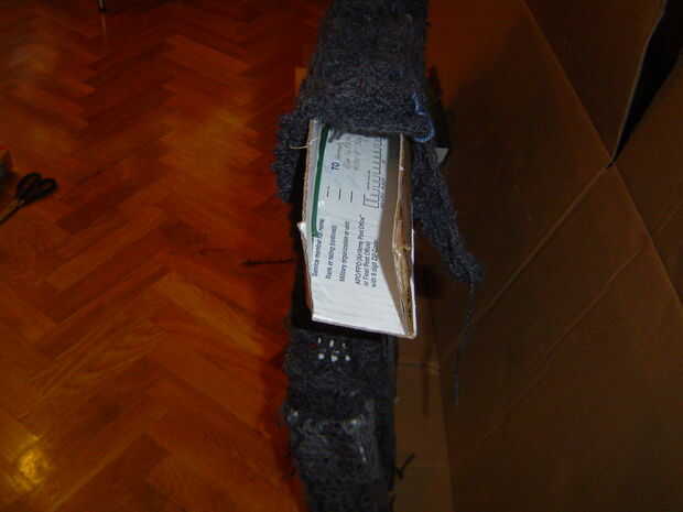 Poner la estructura de soporte en el pedazo de hilo. Esto puede ser bastante complicado, porque la pieza es tan largo. Si la pieza es muy dura tendrá mejor suerte, pero si la pieza empieza a perder su rigidez, es más fácil de poner en la pieza de soporte de la misma manera en que pones un par de medias de nylon. Si nunca le has puesto un par de medias de nylon, encontrar a alguien que tiene que ayudarle.