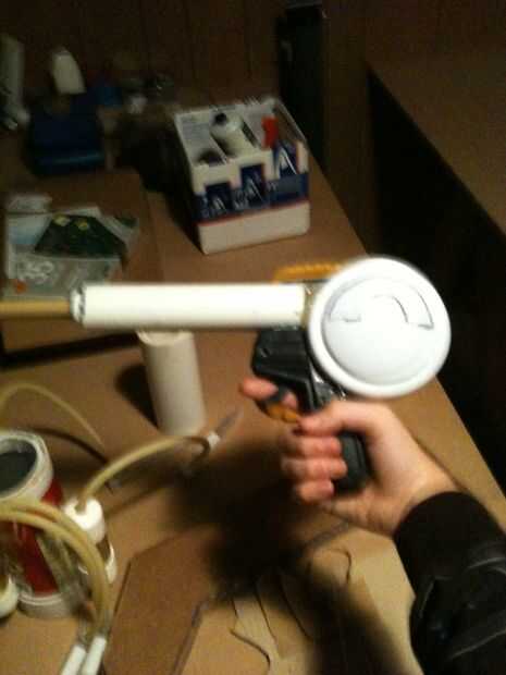 la parte delantera de la pistola se compone de muchas cosas de varios pequeños conectadas entre sí. no está seguro de cómo para explicar estos artículos pero mal tratan de lo mejor que pueda, la foto ayudará mucho si, pero aquí vamos. Tome un tubo de plasitic pequeña y corta a aproximadamente 2 pulgadas, pegarla a una parte de los ambientadores que siguen su movimiento. Conecte a la parte delantera de la pipa del pvc. luego tomar la cosa tapa de batería y péguelo a la pequeña pipa. TKE un plástico palillo cosa y conectar de cerca del frente. la única cosa que es comprensible es hacer una pequeña aleta de cartón tha se sentará en el tubo pequeño. Aquí está la foto al hepl hacia fuera con este paso.