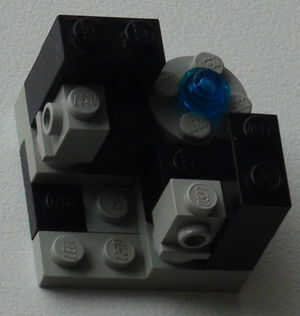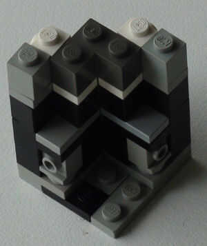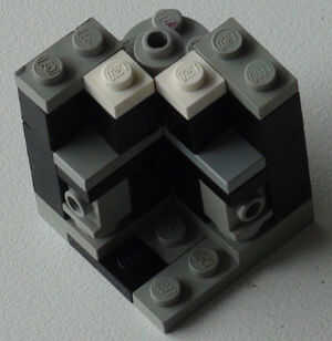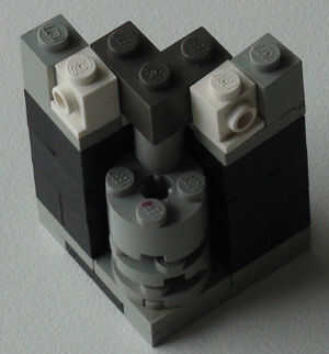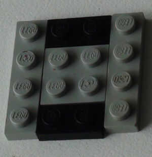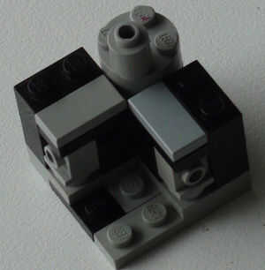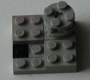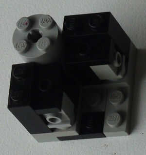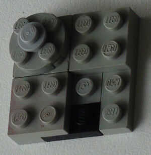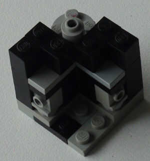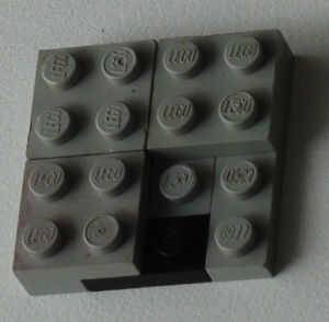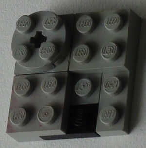 Hay dos 1 x 2 fichas y se sientan en una pieza de 1 x 2 cada uno, esta pieza se conecta sólo al titular de la gris 90° de 1 x 1, hay un espacio de 1 x 1 debajo de él.