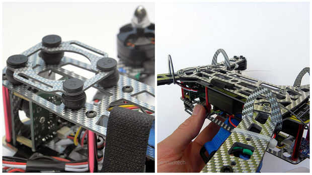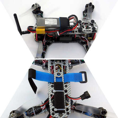 Luego instalamos el paquete de baterías de LiPo de 1800mAh TATTU en nuestro marco. No hay set lugar en cualquier fotograma de la batería y así que esto es gratis para que usted elija para mejor adaptarse a su arreglo. En esta estructura, coloca la batería en la parte posterior de la placa superior, como era el lugar lógico. Ahora, es bastante esencial para la batería a ser bastante segura en su quad, y así que tenemos asegurado con velcro adhesiva y una cinta de velcro. Además de esto, también aseguró el velcro en el quad con ataduras de cremallera, como sabemos el velcro puede fácilmente convertirse en independiente al sacar la batería. Tenga en cuenta en la siguiente imagen que el conector de cable de equilibrio de la batería fue colocado cerca del conector en el sistema FPV, por lo que fácilmente puede ser conectado. En las siguientes imágenes usted también notará que hemos añadido las hélices de los motores. Como se mencionó anteriormente, tiene motores de rotación en sentido horario y motores de rotación en sentido antihorario y así las hélices correctas debe conectarse el motor correcto en esta etapa. Usted necesitará consultar el manual de tu controlador de vuelo para la orientación del motor, que le dirá que helice poner en que motor.