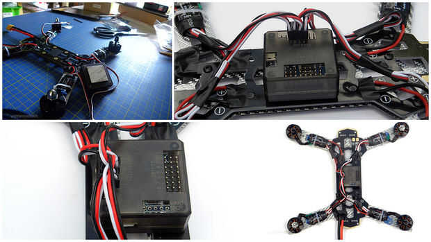 Tenemos habían asegurado el Flip32 + aquí con espuma de montaje de 3 M a la mitad de lo quadcopter (frente a la forma correcta) y luego se procedió a tapar en el CES. Utilizamos los cables de servo para tapar los CES (el cable negro, rojo y blanco) y estos enchufe las clavijas de salida del controlador de vuelo. Esto es porque el controlador de vuelo salidas de información a los CES para controlar la velocidad del motor. Según que controlador de vuelo que está utilizando, cada motor es 1 a 4 números en un orden específico (como se mencionó anteriormente). Necesita conectar el ESC conectado al motor 1 en el pin de salida etiquetado 1 en el controlador de vuelo, salida conectado al motor 2 en el pin marcado 2, etc.. También necesita enchufe los cables de servo en los pernos en la orientación correcta. Los tres cables de colores en el cable (negro, rojo y blanco) corresponden a tierra, voltaje y los cables de la señal respectivamente. Por lo tanto, debe asegurarse que los cables de tierra están conectados a los pines de tierra, los cables de voltaje están conectados a los pines de voltaje y los cables de señal estén conectados a los pines de señal. Vemos esto demostrado en las fotos anteriores. Controladores de vuelo la mayoría tendrá los pines marcados con que pin es tierra, que el pin es de voltaje y cual pin es señal. Por ejemplo, en nuestra Flip32 + guía, usted puede ver que los pasadores están marcados con G, V y 6 (el 6 es para motor 6 pero este es el pin de señal).