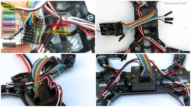 El cable que le sugerimos que utilice aquí tiene 8 cables separados. Sin embargo también puede utilizar un solo cable si usas la salida PPM de su receptor. El primero es un combo de 3 cables (marrón, rojo y naranja) que consiste en un cable de tierra, un cable de alimentación/voltaje y un cable canal. Esto primero alimenta el receptor pero también proporciona una entrada de la canal. El resto de los hilos de este cable son entonces los otros cables de canal, como se puede ver arriba. Ahora, cada canal controla una función de su quad. Para un quad de carreras como la que nos estamos centrando en, sólo necesita 5 canales. Canales 1-4 son el tono básico, rodillo, acelerador y funciones de desvío y generalmente han de tener un quinto canal para cambiar modos de vuelo (es decir, accro, estabilización etc..). En la foto de arriba puedes ver todos los cables de canal conectados pero no es necesario para un quad FPV. Tenga en cuenta que debe enchufar los cables en la orientación correcta es decir en las clavijas de la canal del receptor.