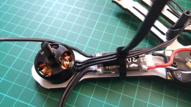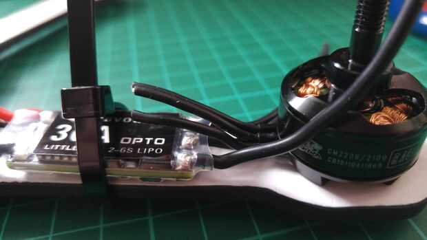 Los cables que salen del motor pueden ser bastante largos, así que tenemos que medirlos y cortarlas. Empezar por ziptieing la ESC a uno de los brazos. En esta etapa, no importa que boom, cualquiera va a hacer. Ahora usted puede ajustar la posición de salida a lo largo de la pluma para ver cómo usted quisiera que ajuste.