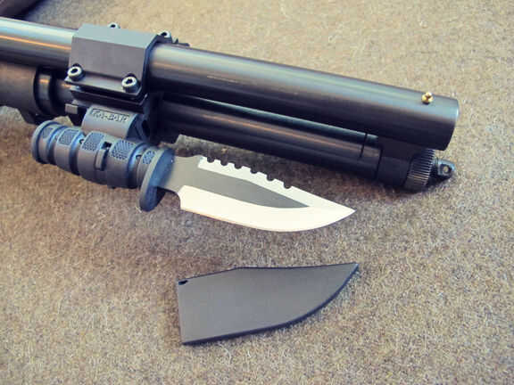 sé por experiencia que uno de los más importantes recursos de supervivencia es un cuchillo de buena calidad. Puede ayudar en casi cualquier tarea relacionados con supervivencia. Encontré un gran 5" cuchillo marca Ka-bar diseñado para montar directamente a un carril de picatinny. La escopeta Mossberg stock no tiene monturas picatinny así compré una unidad de raíl de montaje picatinny de barril. Esto hace que la cuchilla fácilmente accesibles para su rápida implementación. Un cuchillo puede realizar miles de tareas de supervivencia, incluyendo juego de vestir, corte de madera y cordeles, llama la atención un acero del fuego, excavación, raspado, curiosos, de corte y la lista sigue y sigue. Prefiero un cuchillo de supervivencia más grande pero este funciona muy bien. Sacrifiqué el tamaño para la opción de montaje integrado sin costuras.