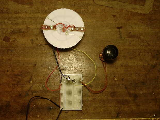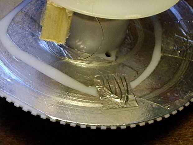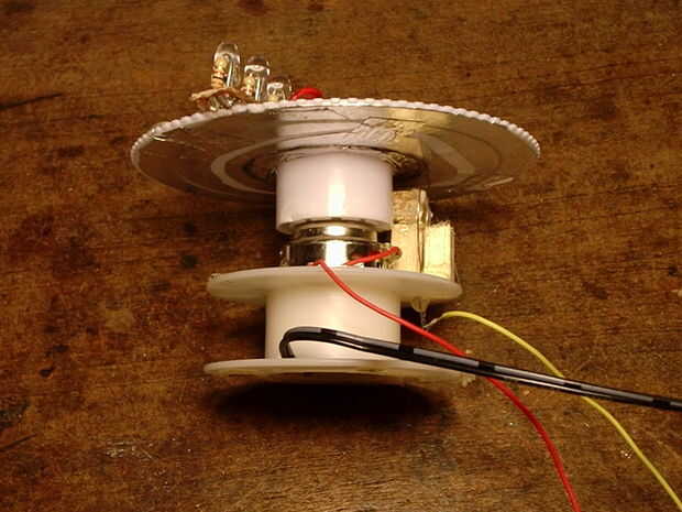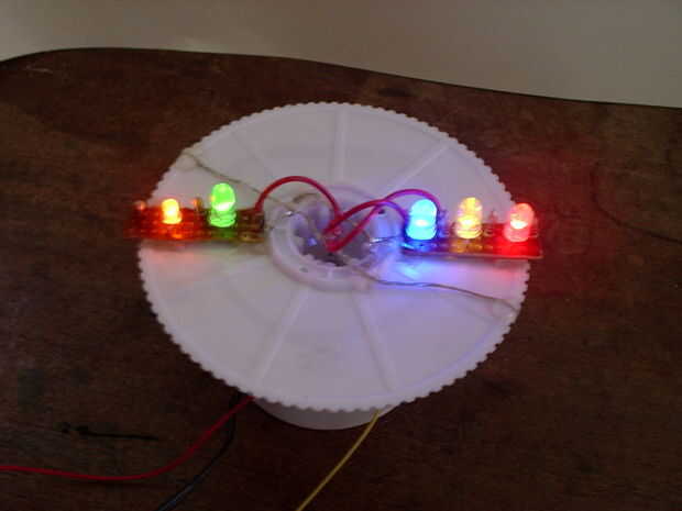 No tarda mucho tiempo hasta que encontré el problema, el cable flexible que está haciendo un contacto eléctrico en el anillo de cinta de aluminio exterior está causando forma de mucha fricción e impide que el motor de giro! Por lo que había hecho algunos ajustes en el cable flexible y que ahora está causando menos fricción y ahora puede girar el motor, pero un sistema de LED no es brillantes! Había mantenido haciendo ajustes en el cable flexible que está haciendo un contacto eléctrico en el anillo de cinta de aluminio exterior para más de 20 minutos, pero yo nunca puedo conseguir perfecto. Ojala que tuviera algunas arandelas gigantes... Así que dejé simplemente y retire el cable flexible que está causando problemas y conectar el anillo de cinta de papel de aluminio exterior para el anillo de cinta papel de aluminio interior con un pequeño trozo de alambre y cinta de papel de aluminio. También he modificado el circuito el oscilador del 555 temporizador, así que ahora ambos conjuntos de LED pueden ser controlados desde una salida negativa.