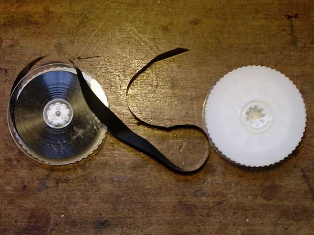 Uno tienes la caja abierta, saque una bobina que tiene la cinta menos o nada, si hay alguna cinta en el carrete, quitarlo y hacer lo que desee hacer con la cinta.