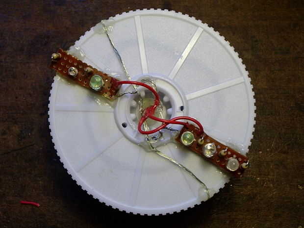 Una vez que han hecho todo lo de la soldadura, pegamento la veroboard con LED del carrete y asegúrese de que pegue la veroboard con LED y cables muy bien en el carrete de lo contrario lo puede ir volando hacia fuera del carrete y golpear otras cosas o personas si son cerrar el dispositivo.