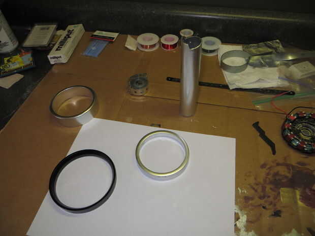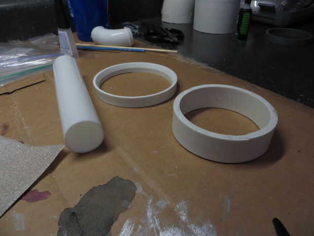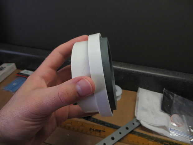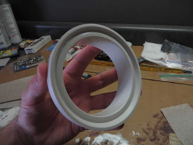 Una vez pintada la pieza de 4 pulgadas debe ser montada alrededor de la pieza más pequeña de 3,5 pulgadas y pegada en su lugar. Está equipado con una superposición de sólo ~1/2 de la anchura del anillo exterior (ver cuadro).