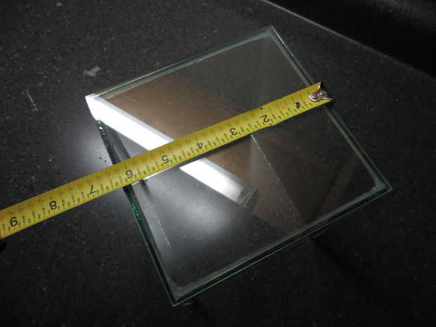 Porque el vidrio puede ser difícil de trabajar con y dejar virutas y desechos que pueden ser peligrosos, tuve la ayuda de una empresa de vidrio para cortar las piezas para mí. Recuerda que si vas sobre las piezas de corte usted mismo, usted debe tener en cuenta el ancho del cristal sí mismo en sus dimensiones. Esto significa, para el cuadro de diámetro indicado anteriormente, usted no puede simplemente cortar 4 pedazos de vidrio 6,25 "x 7,25" y una pieza que es 6.25 x 6.25. Si haces esto acabará con un cuadro que es siempre tan ligeramente fuera de proporción y más grande que esperado. Le di las dimensiones de la caja deseada a la empresa de vidrio y cortaron todas las piezas para mí, teniendo en cuenta el ancho del cristal sí mismo.