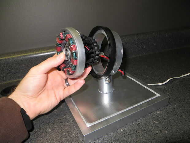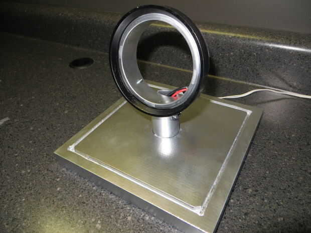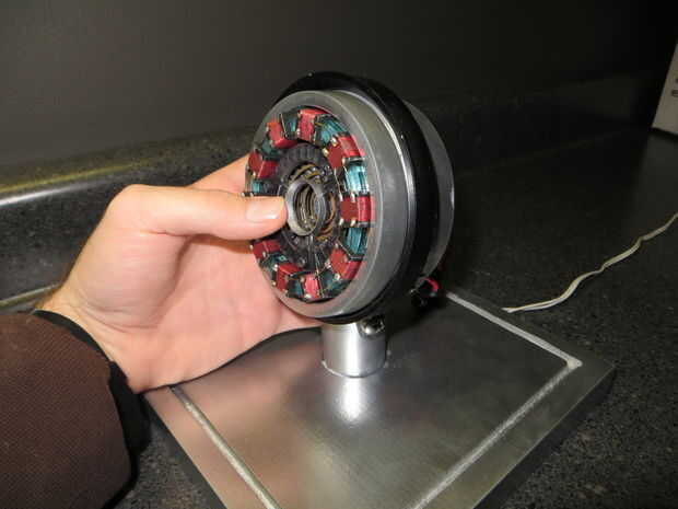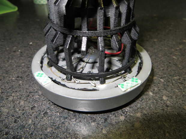 Ahora que todo es por cable tome el reactor de arco completamente montado y coloque cuatro pedazos de cinta de doble cara alrededor del anillo externo de plata (usted podría también pegamento, aunque ello no será removible más adelante). Asiento del reactor de arco en el montaje de reactor, presionando firmemente para obtener buena adherencia de la cinta de doble cara. Conecte el conector CC del reactor de arco a la parte que sobresale de la parte posterior del poste de montaje.