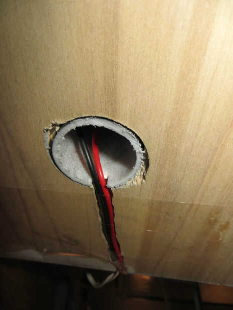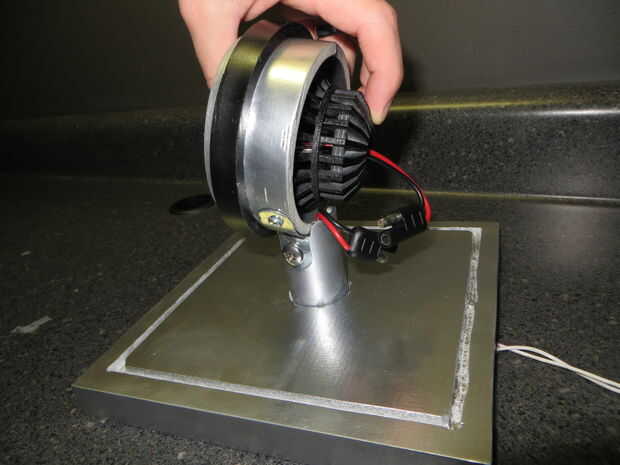Antes de pegar el post de montaje y el montaje en la base, cortar una pequeña muesca en la parte inferior del tubo de poste de montaje. Este es el cableado a través de la alimentación limpia. A continuación, pegue el poste de montaje en el orificio previamente la base ya pintada. Asegúrese de que la tienes orientada para que la parte frontal del reactor será al frente de la base (en una foto anterior que puedes ver etiquetado como "frente" para que no se se mezclan) y que la muesca cortada en el Monte post líneas con el canal de routered en la parte inferior de la base anterior. No quiero tener este conectado accidentalmente alrededor de. Deje que se seque.