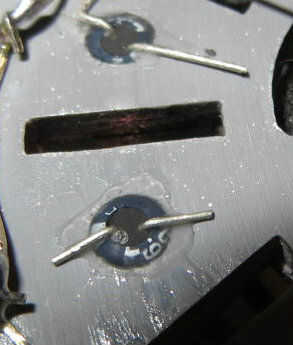 Todo el chasis es una serie de 9 hoyos. Estos agujeros son para los condensadores pequeños que vienen con el kit. Son de aspecto solamente y no desempeñan ningún papel en la electrónica actual. Cada condensador tiene dos alambres de metal pequeño que se pega desde el extremo. Doble los cables 90 grados frente a uno otro para formar una T (los brazos de la T son los cables metálicos, el cuerpo de la T es el condensador).