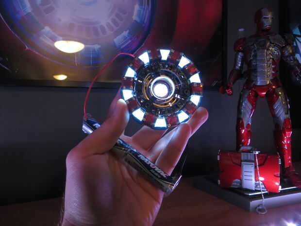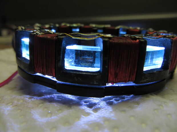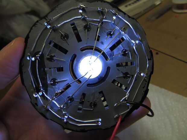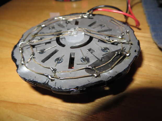 En el paso anterior se colocaron las luces y los dientes fueron torcidos juntos para garantizar las luces en su lugar. Ahora simplemente tienes que colocar una gota de soldadura en cada conexión. Asegúrese de que la soldadura no de goteo entre las puntas largas y cortas y crear una conexión. Esto podría corto tu circuito! Las luces en el centro tienen una conexión de cable pequeño para llevar en el lado positivo y negativo del circuito paralelo en una localización al azar. Un pequeño alambre positivo y negativo fueron el soldado en su lugar para permitir la conexión a la energía de la batería o enchufe. Esto entonces puede ser conectado o bien 2 pilas AA o un adaptador de CA.
