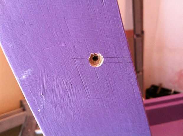 - Perfore un agujero pasante recto y un poco más grande uno (grande oculta cabeza de clavo) en ambos lados de la silla (foto 12).