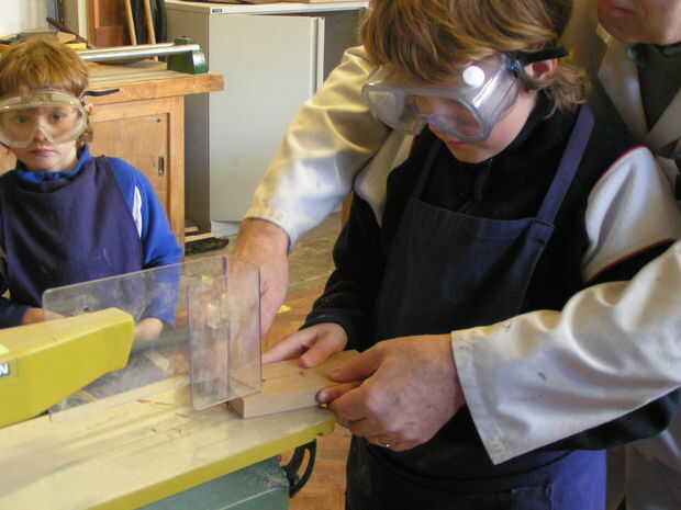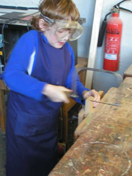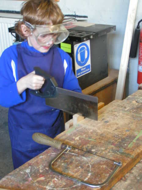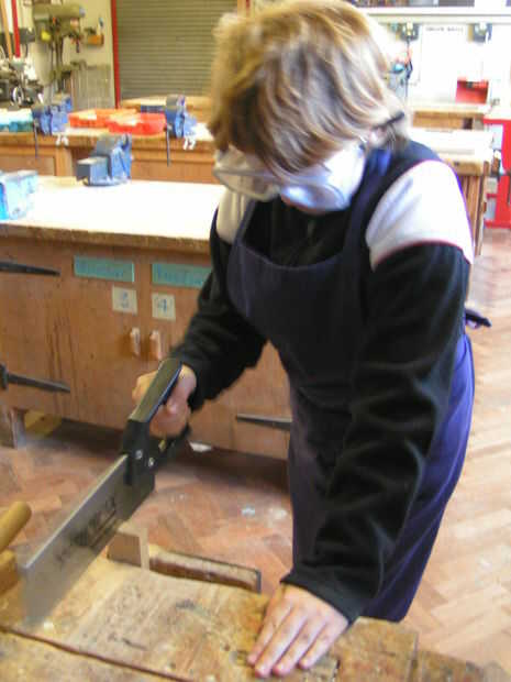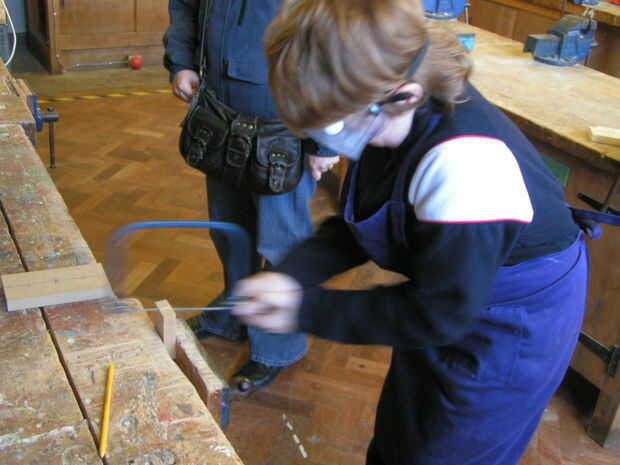 Practica utilizando una sierra de marquetería y una espiga vio en restos de madera y decidió que prefieren utilizar una herramienta eléctrica para cortar sus bases adecuadas.